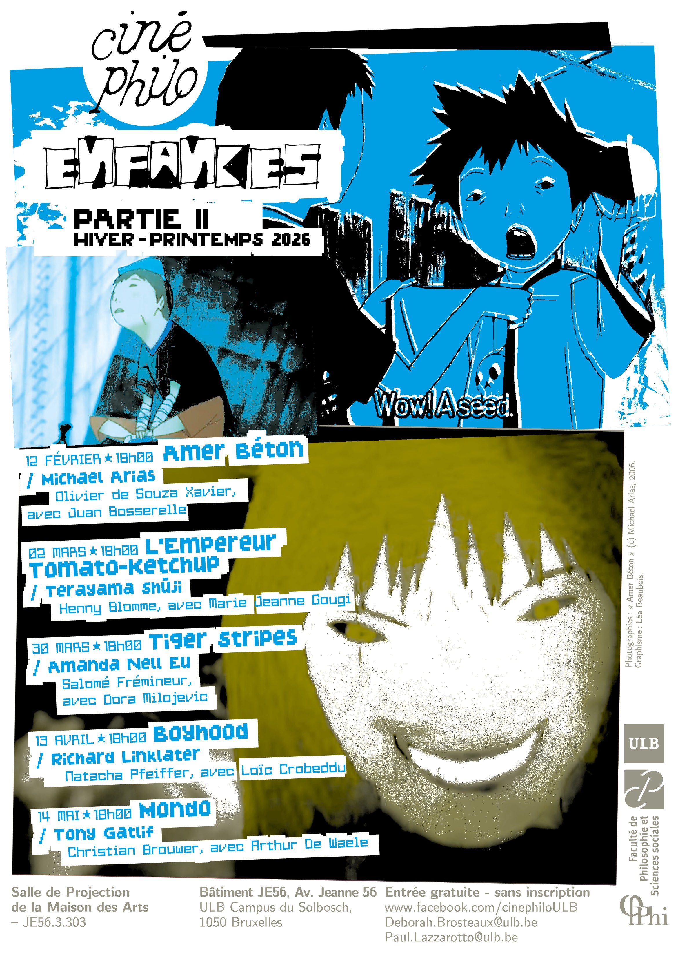 Toutes les séances ont lieu de 18h à 20h30 dans la salle de projection de la Maison des Arts (JE56.3.303), et sont ouvertes à toutes et tous. Après chaque projection, la discussion est ouverte par un·e chercheur·e en philosophie, et modérée par un·e étudiant·e du Département de philosophie, éthique et sciences des religions de l’ULB.