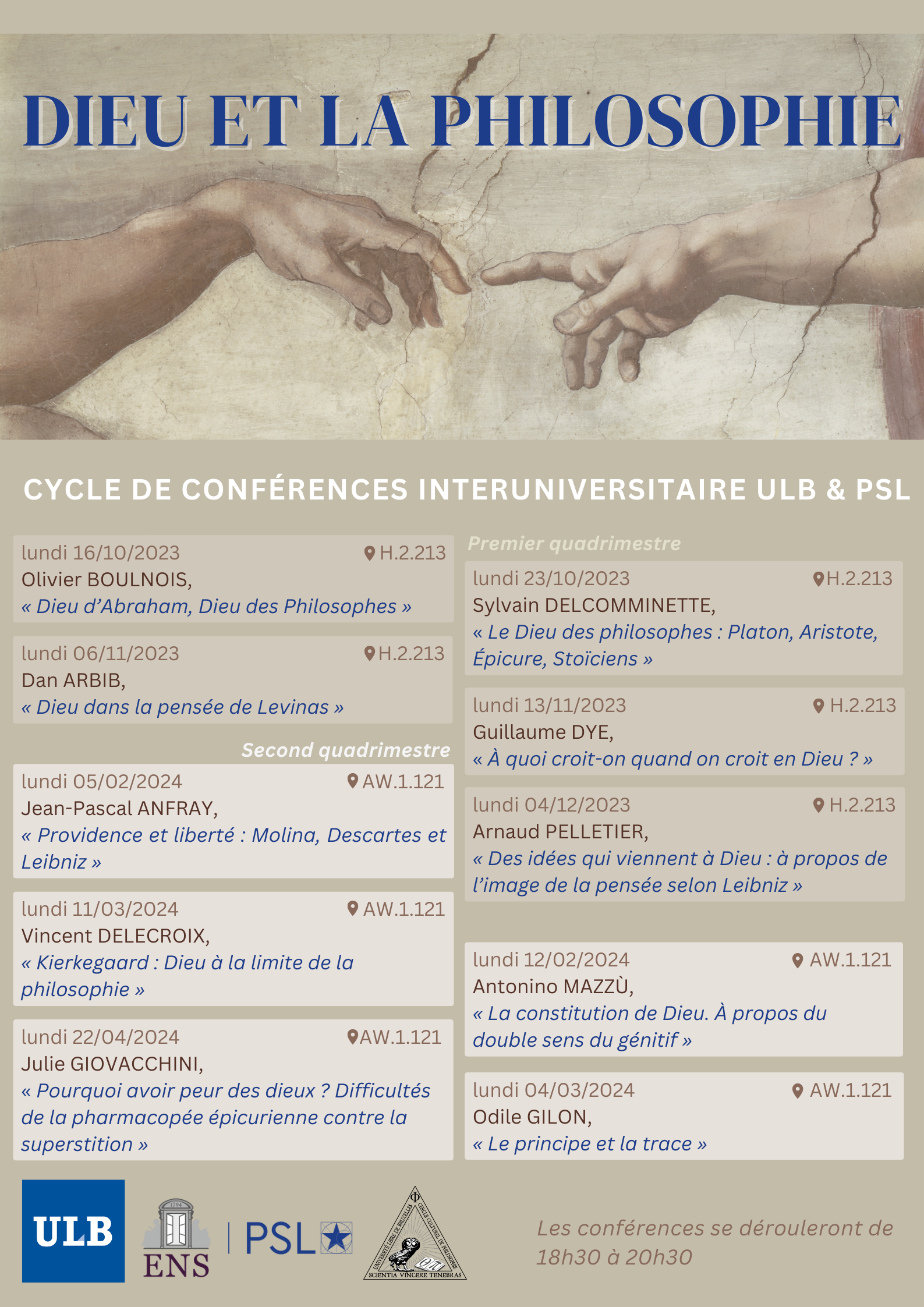 - 23/10/2023, H.2.213 : Sylvain Delcomminette (ULB), « Le Dieu des philosophes : Platon, Aristote, Épicure, Stoïciens ».