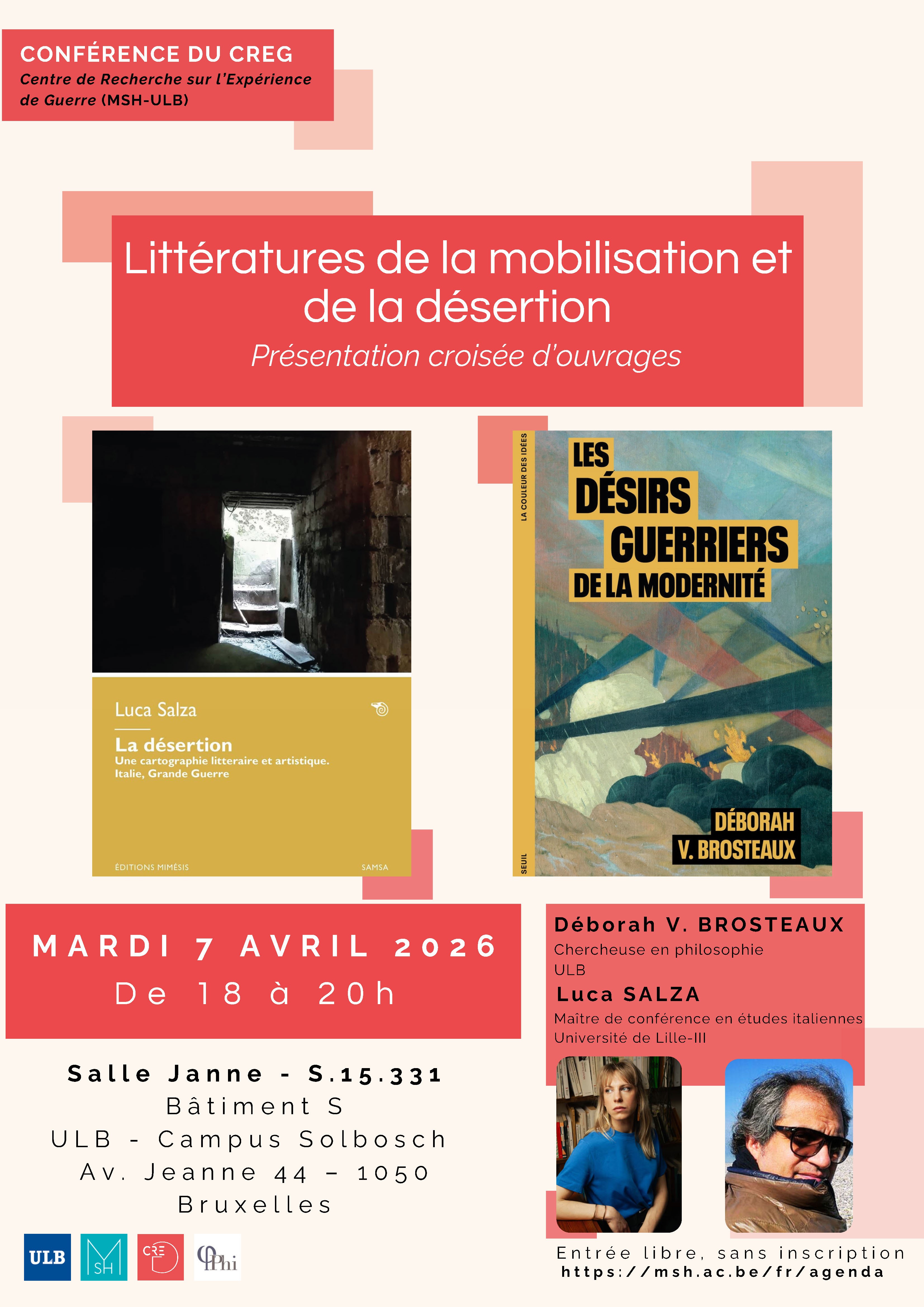 Le CREG a le plaisir de vous inviter à la conférence "Littératures de la mobilisation et de la désertion" qui se tiendra le mardi 7 avril 2026, de 18h à 20h en salle Janne (Bâtiment S - Niveau 15 - S.S.15.331). Cette rencontre est organisée en partenariat avec le Centre de recherche en philosophie de l’ULB.